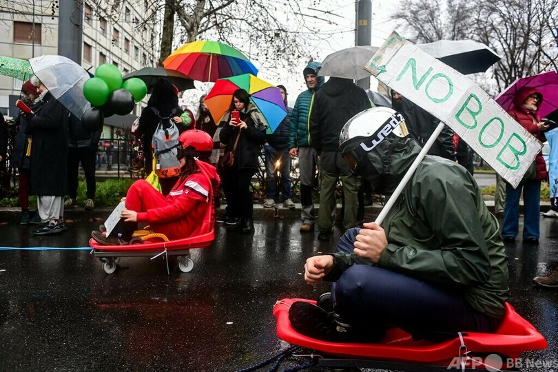 雨が降る中、参加者は圧力団体「持続不能な五輪委員会(Unsustainable Olympics Committee)」やハイカーのネットワーク、環境活動家、文化財保存協会、左翼団体の主導でミラノ市街を行進。物議を醸しているボブスレーのコースなど、大会へ向けたインフラ整備に反対した。各団体は、五輪がイタリアの山岳やミラノの住宅費に悪影響を及ぼすと訴え、前週も小規模な抗議を行っていた。