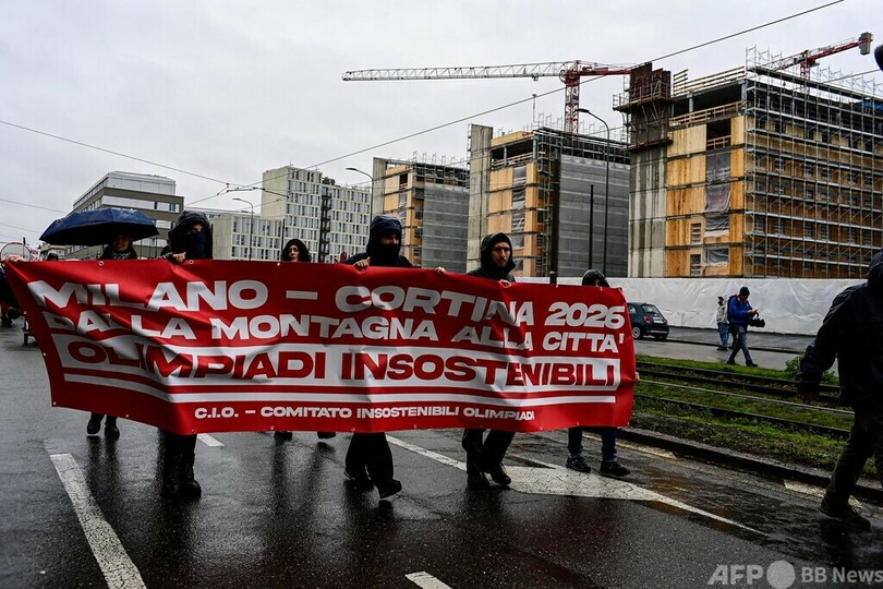 雨が降る中、参加者は圧力団体「持続不能な五輪委員会(Unsustainable Olympics Committee)」やハイカーのネットワーク、環境活動家、文化財保存協会、左翼団体の主導でミラノ市街を行進。物議を醸しているボブスレーのコースなど、大会へ向けたインフラ整備に反対した。各団体は、五輪がイタリアの山岳やミラノの住宅費に悪影響を及ぼすと訴え、前週も小規模な抗議を行っていた。