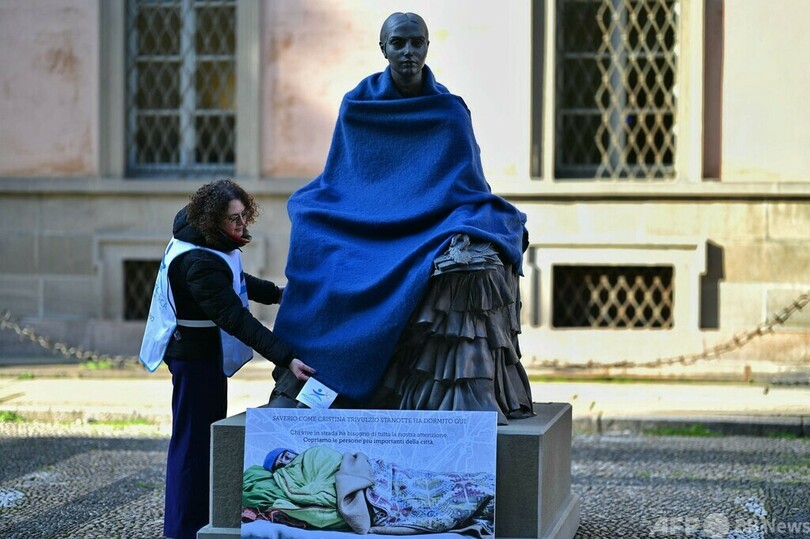 ダビンチ像に青い毛布 ホームレスの現状を啓発 伊ミラノ