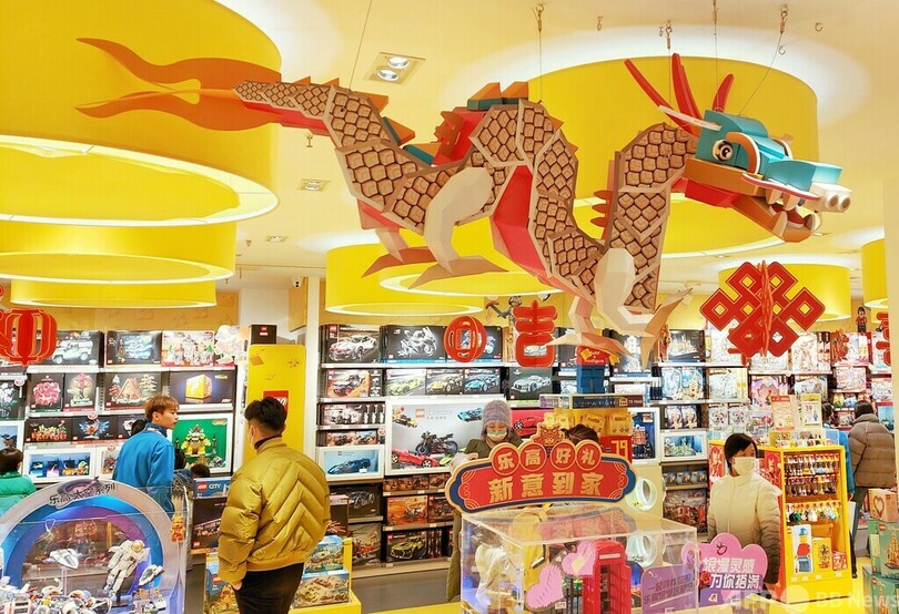 干支経済が盛り上がる中、海外ブランドや新たな消費ブランドも参加している。大人気のディズニー(Disney)IPキャラクター、リーナ・ベル(LinaBell)は龍の尾を持つようになり、龍の頭の帽子をかぶったダッフィー(Duffy)も現れた。日本の化粧品ブランド、シュウウエムラ(shu uemura)は辰年限定の化粧品を発売し、「龍女色」の口紅が大人気だ。レゴ(Lego)公式旗艦店は天猫(Tmall)限定の「一匹の龍」新春ギフトセットを発売したが、すぐに完売になり、中古市場では数百元(100元が約2089円)のプレミアムがついている。(c)CNS/JCM/AFPBB News