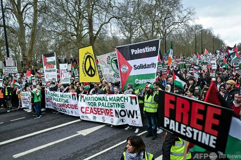 【2月18日 AFP】英ロンドンで17日、数万人規模の親パレスチナデモが行われ、人種的憎悪の扇動や警察官への暴行などの容疑で12人が逮捕された。