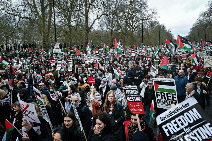 【2月18日 AFP】英ロンドンで17日、数万人規模の親パレスチナデモが行われ、人種的憎悪の扇動や警察官への暴行などの容疑で12人が逮捕された。
