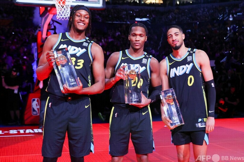 スキルズチャレンジは、タイリース・ハリバートン(Tyrese Haliburton)、ベネディクト・マサリン(Bennedict Mathurin)、マイルス・ターナー(Myles Turner)の3人で臨んだインディアナ・ペイサーズ(Indiana Pacers)が、チームオールスターとのタイブレークを制して優勝した。(c)AFP