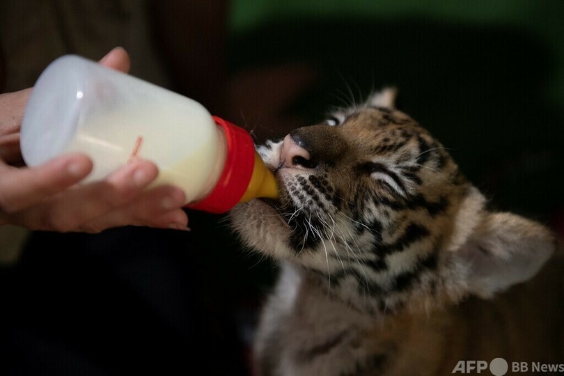 赤ちゃんの世話をしている野生動物看護士のラウラ・カレーニョさんは「この赤ちゃんを母親トラに任せていたら、他の赤ちゃんトラも死んでいたと思います。この赤ちゃんにはどうしても薬が必要でした」と飼育に至った経緯を説明した。(c)AFP