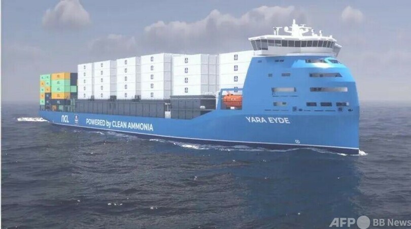 同船は欧州内の内航フィーダー船で、主にノルウェー―ドイツ航路に就航し、全長は約150メートル、型幅は約27メートルで、20フィート標準コンテナ約1400個の積載が可能で、アンモニア燃料エンジン、アンモニア燃料貯蔵タンク、供給システム、充填システムを搭載しています。(c)CGTN Japanese/AFPBB News
