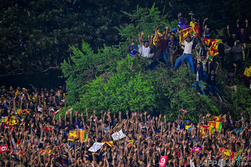 【今日の1枚】クリケット観戦者が熱狂、重さに耐える木の枝 スリランカ