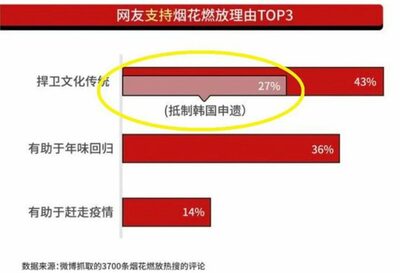 その結果、最も多い43%が「伝統文化保全のために再び許可しなければならない」と答えた。このうち「韓国がユネスコ世界遺産に『花火』を申請し、中国の文化を奪おうとしている」という意見が27%を占めた。