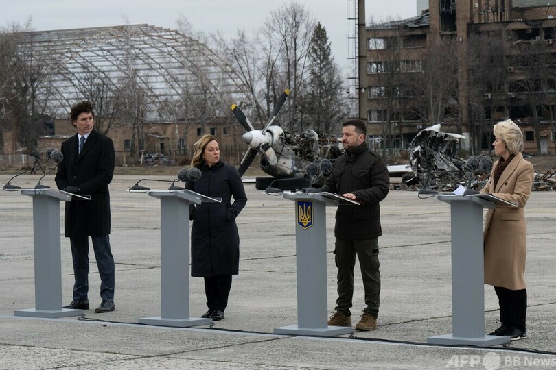 欧州連合(EU)のウルズラ・フォンデアライエン(Ursula von der Leyen)欧州委員長、カナダのジャスティン・トルドー(Justin Trudeau)首相、イタリアのジョルジャ・メローニ(Giorgia Meloni)首相はキーウを訪れ、ゼレンスキー氏と行動を共にした。