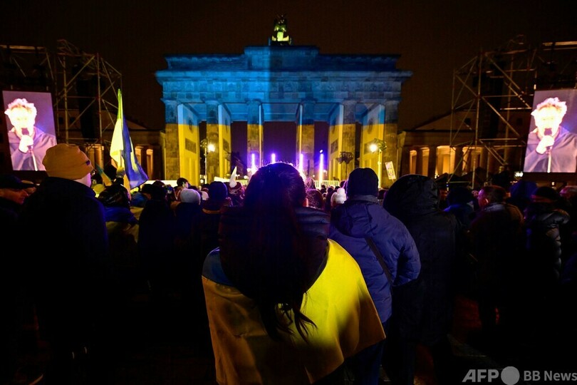 【2月24日 AFP】(写真追加)ロシアによるウクライナ侵攻が始まってから2年となる24日、欧米各地でウクライナを支持するデモや集会が行われた。