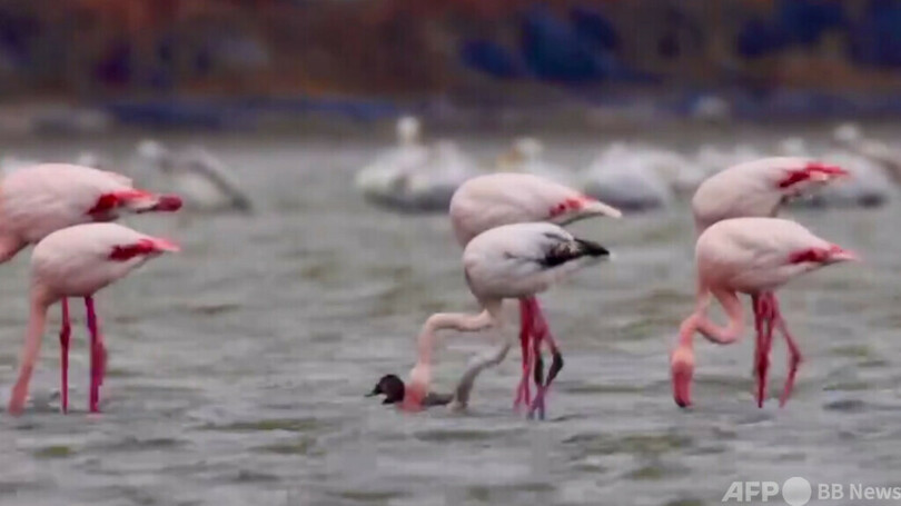 2015年に条子泥湿地で初めてフラミンゴが発見されて以来、2023年末の時点で9年連続で越冬フラミンゴが観察・記録されており、その数は当初の1羽から現在は14羽に増加していることが分かった。(c)東方新報/AFPBB News