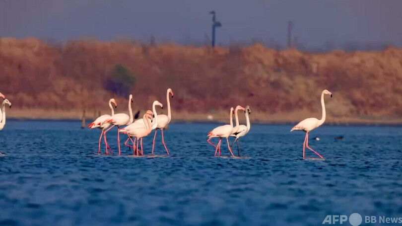 2015年に条子泥湿地で初めてフラミンゴが発見されて以来、2023年末の時点で9年連続で越冬フラミンゴが観察・記録されており、その数は当初の1羽から現在は14羽に増加していることが分かった。(c)東方新報/AFPBB News