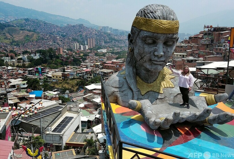 【3月17日 AFP】コロンビア・メデジン(Medellin)の自然をたたえてアーティストのホルヘ・ハラミージョ(Jorge Jaramillo)氏と3Dプリント製作者のフアン・デイビッド・エスカンドン(Juan David Escandon)氏が制作した大地の女神パチャママ(Pachamama)像の手のひらに乗る観光客。高さ5.5メートル幅5.5メートルの像を作るために20台のプリンターを駆使し、1500個の部位をつなぎ合わせた。(c)AFP