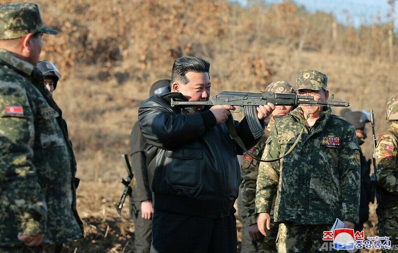 黒い革のジャケットを着用した金氏は、射撃訓練を視察し兵器を点検。自ら銃を持ち、迷彩服を着た兵士たちに直接指導した。