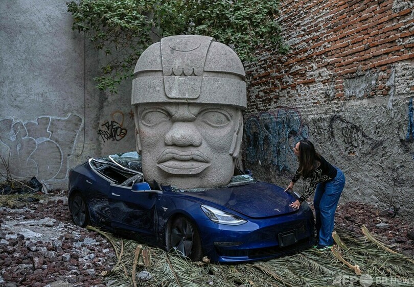 【3月15日 AFP】米電気自動車(EV)大手テスラ(Tesla)の車が、先住民の彫刻のような巨石頭に押しつぶされている──事故現場ではなく、テスラのイーロン・マスク(Elon Musk)最高経営責任者(CEO)を挑発したかったというメキシコ人アーティストの作品だ。