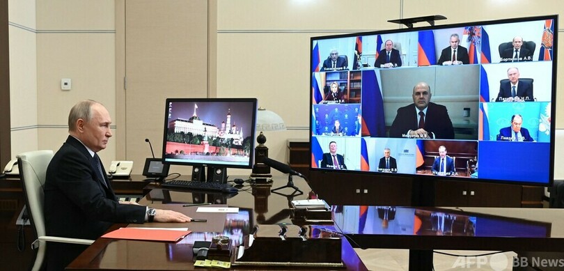 ロシア大統領府(クレムリン、Kremlin)は、プーチン氏がウクライナへの報復を表明した後、執務室のパソコンでオンライン投票を行い、カメラに向かって手を振る映像を配信した。(c)AFP