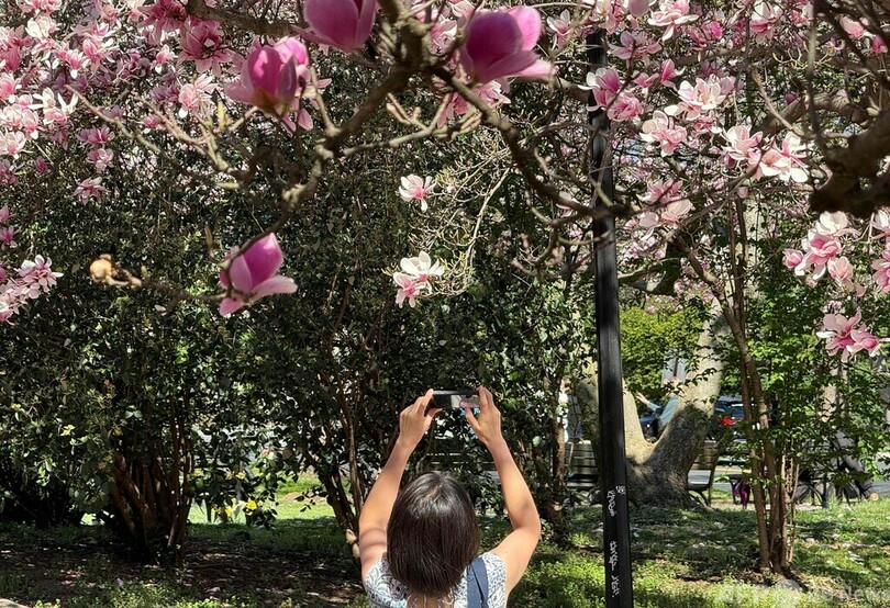 大輪のサラサモクレンも開花。観光客らは芝生の緑と、散った花の鮮やかなコントラストも楽しんでいた。(c)AFP