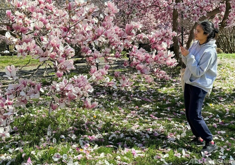 大輪のサラサモクレンも開花。観光客らは芝生の緑と、散った花の鮮やかなコントラストも楽しんでいた。(c)AFP