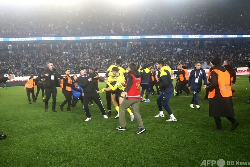 騒動が起こったのはフェネルバフチェが3-2で勝利した試合後で、ホームのトラブゾンスポルのサポーターが大量にピッチへ侵入。映像では、サポーターの一人が勝利を喜ぶフェネルバフチェの選手に駆け寄り、選手数人もその人物に近づいて殴ろうとしているように見える。その後、他のサポーターもピッチへなだれ込んだ。