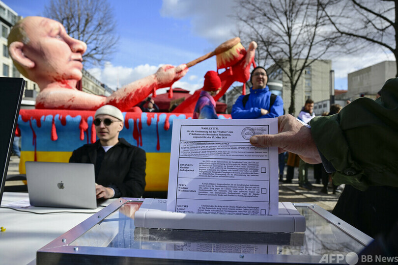 血まみれのプーチン氏像も登場 独ベルリンでロシア大統領選に抗議