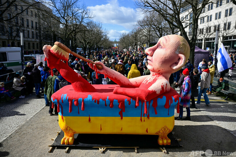 血まみれのプーチン氏像も登場 独ベルリンでロシア大統領選に抗議
