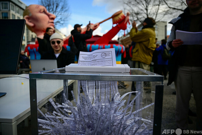 血まみれのプーチン氏像も登場 独ベルリンでロシア大統領選に抗議
