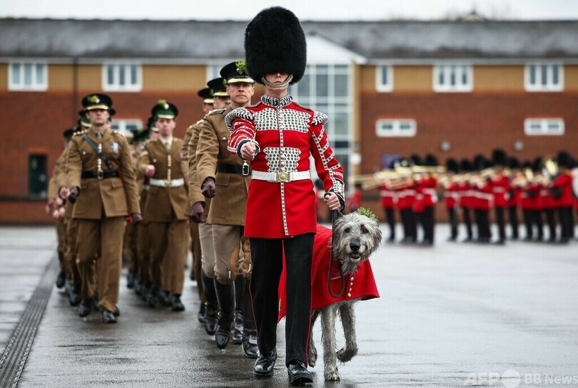 【3月26日 AFP】英ロンドンの南西にあるオールダーショット(Aldershot)の軍施設で行われた聖パトリック・デー(St Patrick's Day)を祝うアイルランド近衛連隊(アイリッシュガーズ、Irish Guards)のパレードに参加した隊のマスコット犬、3歳のアイリッシュ・ウルフハウンドのシーマスとハンドラー。(c)AFP