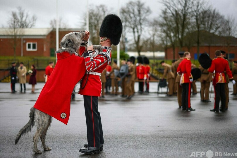 【3月26日 AFP】英ロンドンの南西にあるオールダーショット(Aldershot)の軍施設で行われた聖パトリック・デー(St Patrick's Day)を祝うアイルランド近衛連隊(アイリッシュガーズ、Irish Guards)のパレードに参加した隊のマスコット犬、3歳のアイリッシュ・ウルフハウンドのシーマスとハンドラー。(c)AFP