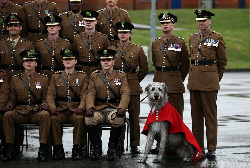 【3月26日 AFP】英ロンドンの南西にあるオールダーショット(Aldershot)の軍施設で行われた聖パトリック・デー(St Patrick's Day)を祝うアイルランド近衛連隊(アイリッシュガーズ、Irish Guards)のパレードに参加した隊のマスコット犬、3歳のアイリッシュ・ウルフハウンドのシーマスとハンドラー。(c)AFP