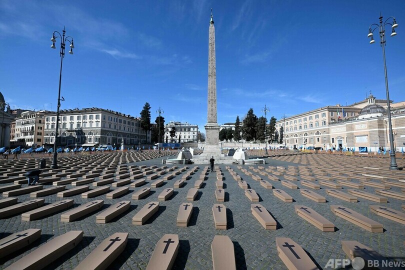 【3月20日 AFP】イタリア労働連合(UIL)は19日、労働災害による昨年の死亡者数が1041人だったと発表し、首都ローマのポポロ広場(Piazza del Popolo)に1041個のひつぎを並べて啓発活動を行った。