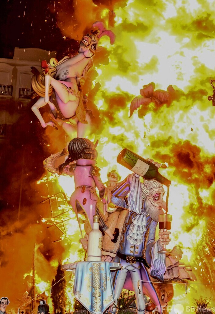 【3月20日 AFP】スペイン・バレンシア(Valencia)で開かれていた恒例の火祭り「ファリャス(Las Fallas)」が19日、最終日を迎え、祭りのために作られた張り子の人形「ニノット(Ninot)」や、ニノットで飾られた山車「ファリャ」が燃やされた。