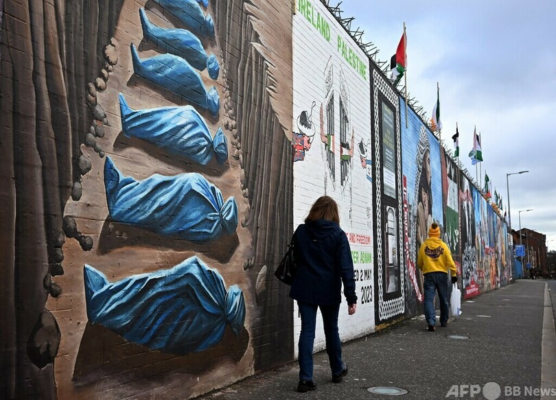 【3月31日 AFP】北アイルランド・ベルファストのフォールズロード(Falls Road)にある「インターナショナル・ウォール(International Wall)」にパレスチナの人々に連帯を示して描かれた壁画と、その前を歩く歩行者。(c)AFP