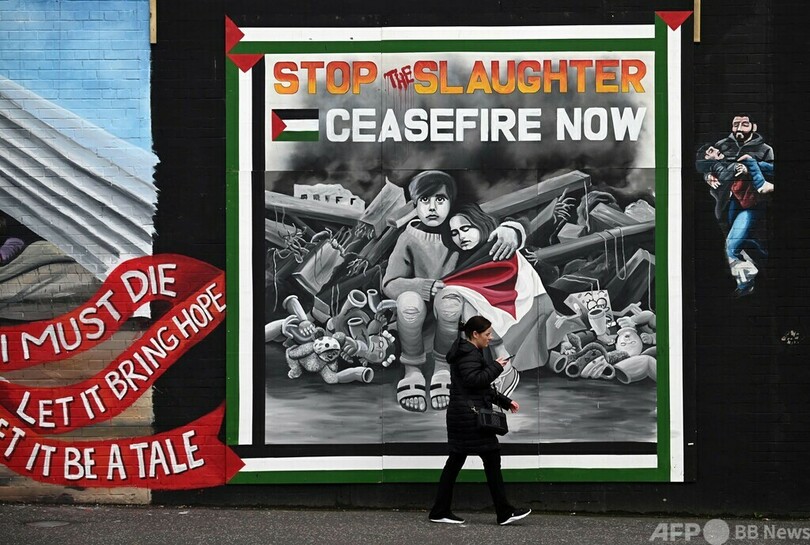 【3月31日 AFP】北アイルランド・ベルファストのフォールズロード(Falls Road)にある「インターナショナル・ウォール(International Wall)」にパレスチナの人々に連帯を示して描かれた壁画と、その前を歩く歩行者。(c)AFP