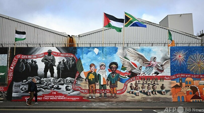 【3月31日 AFP】北アイルランド・ベルファストのフォールズロード(Falls Road)にある「インターナショナル・ウォール(International Wall)」にパレスチナの人々に連帯を示して描かれた壁画と、その前を歩く歩行者。(c)AFP