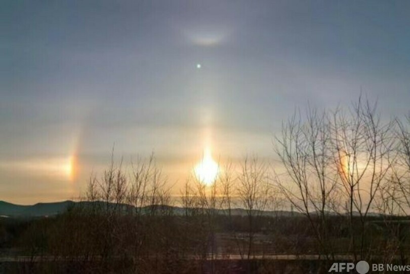 「幻日」は大気光学現象の一種で、太陽光が半透明の薄雲の中にある六角形の氷の結晶に当たって屈折現象が発生し、複数の太陽の幻像を形成するものです。(c)CGTN Japanese/AFPBB News