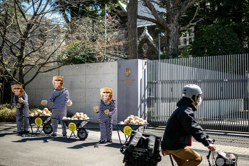 【3月28日 AFP】動物愛護団体「動物の倫理的扱いを求める人々の会(PETA)」は27日、東京都品川区の在東京タイ大使館前で、ブタオザルを使ったココナツ収穫の廃止を求めるデモを行った。