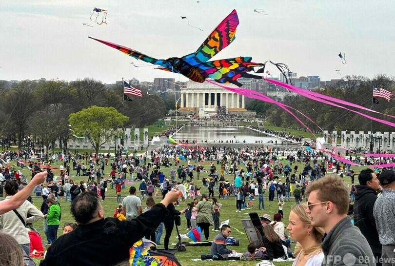 【3月31日 AFP】米首都ワシントンで30日、さまざまな色や形のたこが空を舞った。たこ揚げイベントは、毎年恒例の桜祭りの一環として行われている。
