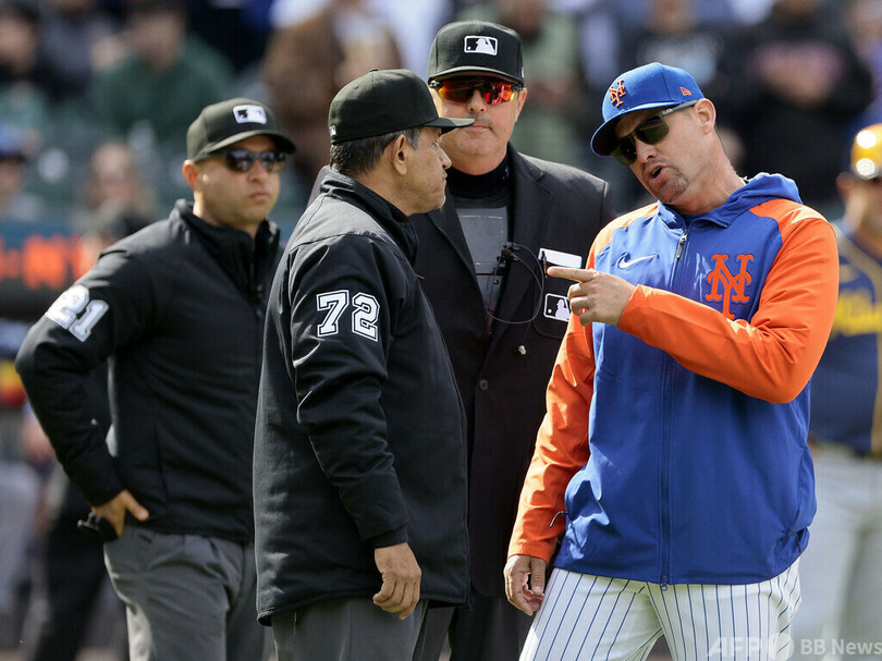 メッツのカルロス・メンドーサ(Carlos Mendoza)監督も1試合のベンチ入り禁止処分を科されており、31日のブルワーズ戦でこれを消化した。(c)AFP