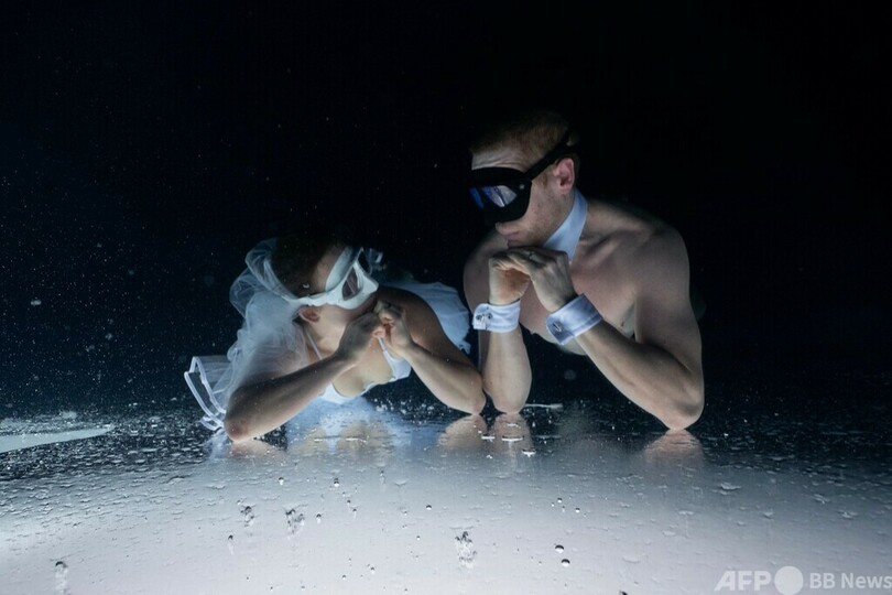 マキ・ユシラさんはちょうネクタイ姿、キビヤルビさんはウエディングドレスを模した水着で、水温0.5度、厚さ80センチの氷の下で華麗に泳いだ。この季節のラップランドの気温は零下5~9度だという。