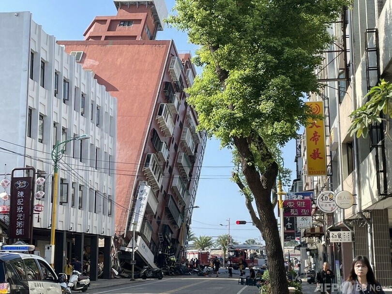 現地テレビは、花蓮市内やその他の地域で傾いたり倒壊したりした建物の様子を報じている。(c)AFP