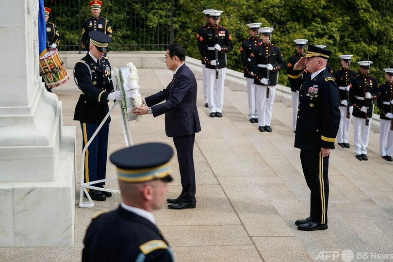 【4月10日 AFP】国賓待遇で訪米中の岸田文雄(Fumio Kishida)首相は9日、首都ワシントン郊外にあるバージニア州のアーリントン国立墓地(Arlington National Cemetery)を訪れ、無名戦士の墓に献花した。