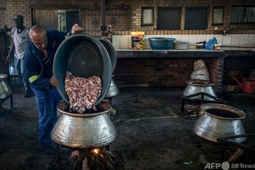 【4月18日 AFP】南アフリカ・レナシア(Lenasia)のモスク(イスラム礼拝所)で、断食月「ラマダン(Ramadan)」明けの祝祭「イード・アル・フィトル(Eid al-Fitr)」で配る食事を準備するボランティアスタッフ。(c)AFP