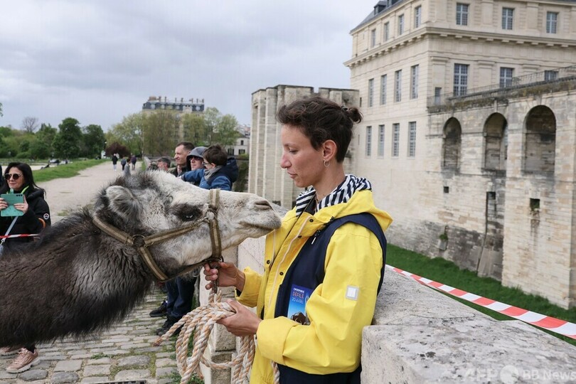 【4月27日 AFP】フランス・パリ近郊のバンセンヌ城(Chateau de Vincennes)の前で行われたラクダ科の動物のパレード「アメージング・パレード(Amazing parade)」に出たラクダ。パリ行政裁判所は、20日にエッフェル塔(Eiffel Tower)界隈で予定されていたラクダ、ヒトコブラクダ、ラマ、アルパカなど50頭余りによるパレードを禁じた警察判断を支持した。(c)AFP