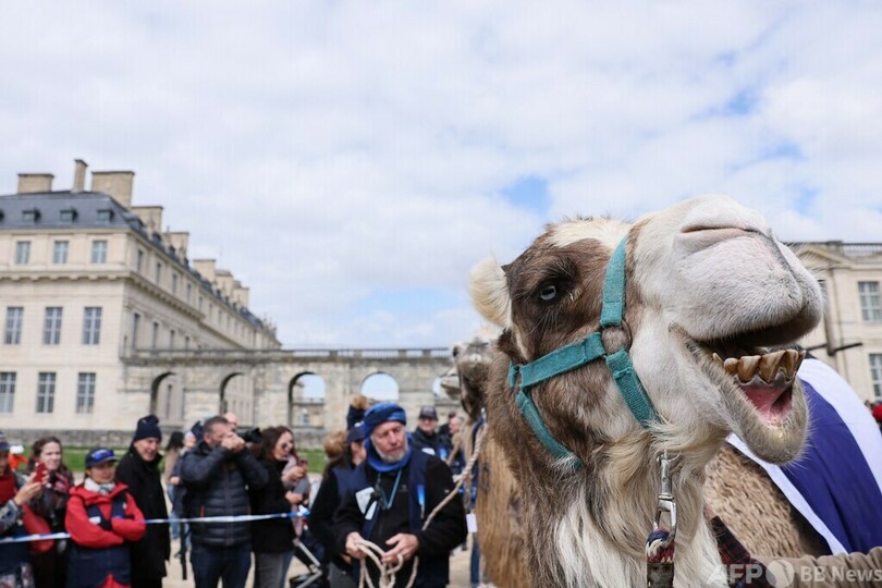 【4月27日 AFP】フランス・パリ近郊のバンセンヌ城(Chateau de Vincennes)の前で行われたラクダ科の動物のパレード「アメージング・パレード(Amazing parade)」に出たラクダ。パリ行政裁判所は、20日にエッフェル塔(Eiffel Tower)界隈で予定されていたラクダ、ヒトコブラクダ、ラマ、アルパカなど50頭余りによるパレードを禁じた警察判断を支持した。(c)AFP