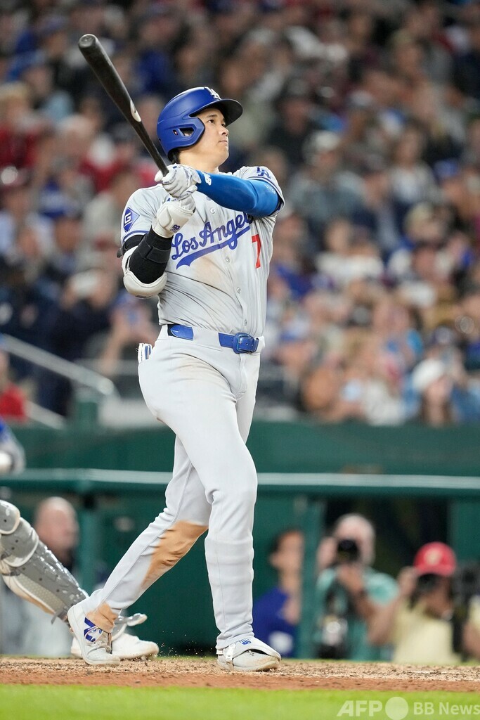 【4月24日 AFPBB News】米大リーグ(MLB)は23日、各地で試合が行われ、ロサンゼルス・ドジャース(Los Angeles Dodgers)の大谷翔平(Shohei Ohtani)はワシントン・ナショナルズ(Washington Nationals)戦に2番・指名打者(DH)で先発出場し、9回に2試合連発となる第6号ソロを放つなど4打数1安打1打点、1四球だった。チームは4-1で勝利した。(c)AFPBB News