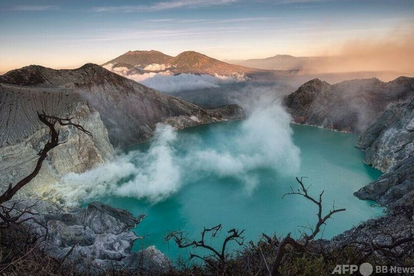 イジェン火山は硫黄分を多く含み、夜になると見える硫黄が燃える神秘的かつ幻想的な青い炎は世界各地の観光客を引きつけています。イジェン火山に登る時には、火山灰や有毒ガスを除去するための防護マスクを着用し、足元を照らすためにヘッドライトを着用する必要があります。今回の転落事故が起きた火口脇にある木はイジェン火山見物の有名な撮影スポットで、ソーシャルメディアでは、この木とともに記念撮影された写真が多く投稿されています。(c)CGTN Japanese/AFPBB News