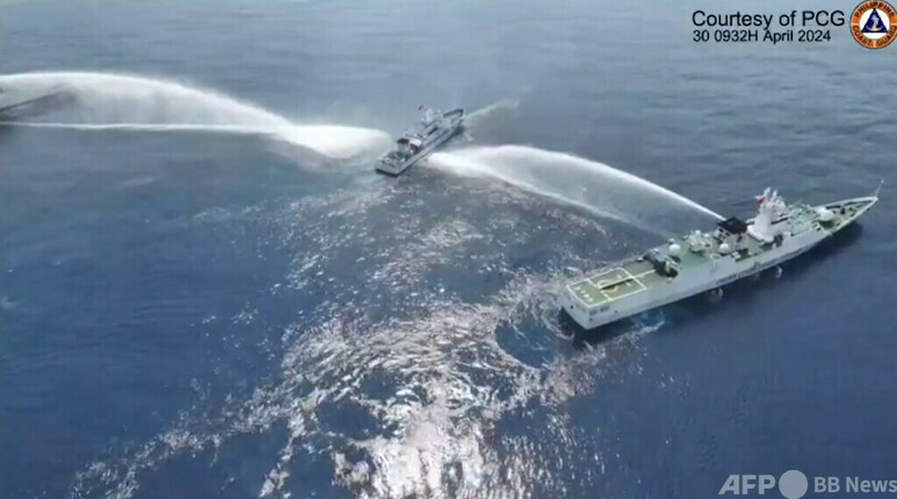 沿岸警備隊は、「フィリピン船は中国海警局の船4隻と海上民兵の船6隻から危険行為と妨害を受けた」と説明。沿岸警備隊の船舶が両側から放水銃を浴び、手すりと天蓋(てんがい)が破損したとしている。