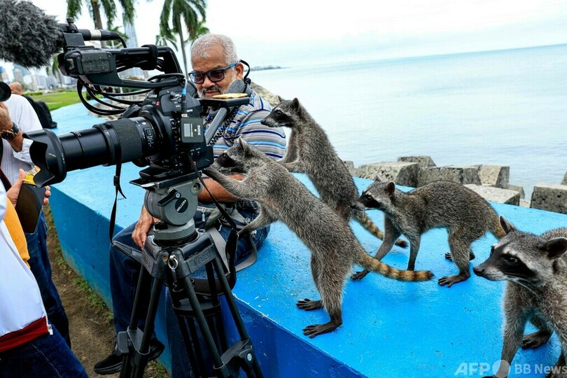 【5月6日 AFP】パナマ・パナマ市で、選挙運動中の大統領候補のホセ・ラウル・ムリノ(Jose Raul Mulino)氏が出てくるところを待つカメラマンに近づくアライグマ。大統領選の投票は5月5日に行われる。(c)AFP
