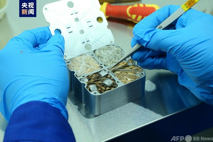 材料類科学実験のサンプルは、宇宙船「神舟17号」の帰還モジュールと共に北京市に輸送され、科学者は地上と宇宙でのサンプルの組織形態、化学成分およびその分布の違いなどに関する試験や分析を行い、材料の成長、成分の偏析、凝固不良に与える重力の影響を研究し、重要な新材料の研究開発をサポートします。(c)CGTN Japanese/AFPBB News