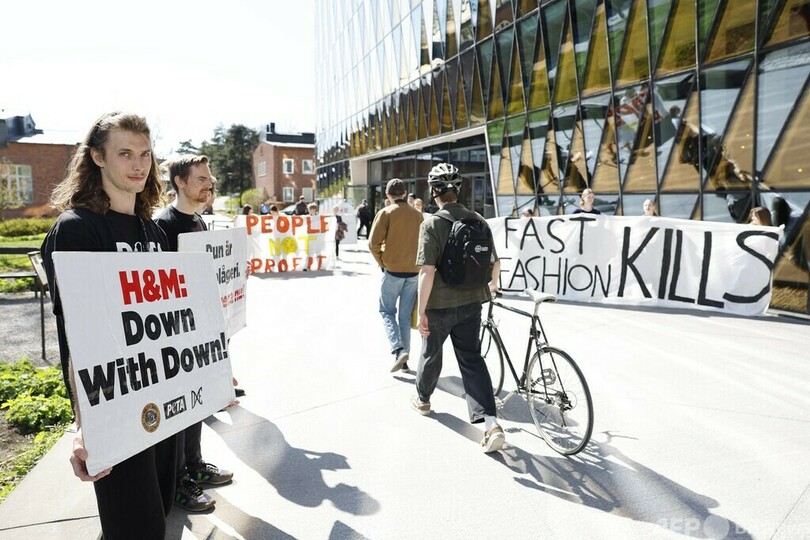 グレタさんらは、首都ストックホルムで開かれたH&M年次株主総会の会場前で、「H&Mのファストファッションは命を奪う」と書かれた横断幕を掲げた。