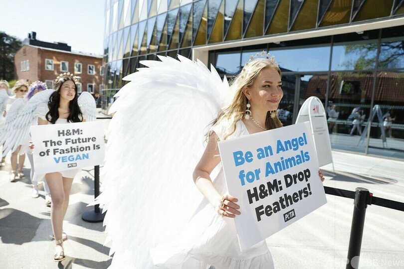 同会場前では、動物愛護団体「動物の倫理的扱いを求める人々の会(PETA)」もデモを実施。動物由来の素材を使用しない「ビーガンファッション」を要求した。PETAの活動家らは天使に扮(ふん)して「未来のファッションはビーガンだ」「動物にとっての天使になって。羽毛の使用中止を!」などと書かれたプラカードを掲げた。(c)AFP